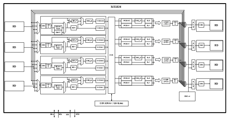 MS1826是一款多功能視頻處理器,包含4路獨立HD音視頻輸入通道、4路獨立HD音視頻輸出通道以及四路獨立可配置為輸入或者輸出的SPDIF、I²S音頻信號。支持4個獨立的字庫定制型OSD;可處理隔行和逐行視頻或者圖形輸入信號;有四路獨立視頻播放引擎可支持視頻多路播放。該產(chǎn)品提供了高質(zhì)量的視頻輸出,有解隔行輸入、視頻增強,以及幀率轉(zhuǎn)換的處理能力。
