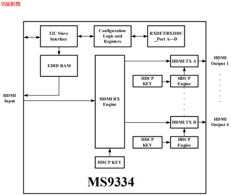 MS9334是一款最高信號(hào)速率可達(dá)3Gbps的HD信號(hào)1分4分配器芯片。在3Gbps的速率下,MS9334可以支持到4K@30Hz分辨率的HD輸入信號(hào)。同時(shí)可以支持10/12/16位的色深。HD輸入端的時(shí)鐘與數(shù)據(jù)恢復(fù)功能可以自適應(yīng)不同長(zhǎng)度不同質(zhì)量的線材,使得在高速率下傳輸?shù)腡MDS信號(hào)始終具有最佳性能。HD輸出端具有信號(hào)預(yù)加重功能,可以支持長(zhǎng)線傳輸。MS9334集成內(nèi)部EDID RAM和HDCP KEY RAM。