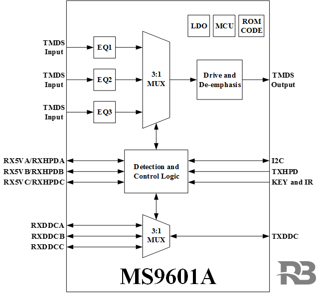 MS9601A是一款最高信號速率可達(dá)3Gbps的HD信號3進(jìn)1出切換器芯片。在3Gbps的速率下,MS9601A可以支持4K×2K@30Hz和4K×2K(YCbCr420)@60Hz分辨率的HD輸入信號。芯片內(nèi)同時集成了DDC和HPD通道的切換器,會和對應(yīng)的TMDS通道同時進(jìn)行切換。可以使用內(nèi)置的2個電壓轉(zhuǎn)換器給芯片供電,不再需要額外的電源電路,節(jié)省了電路板面積和BOM成本。為了更加靈活的使用,芯片可以選擇使用具有內(nèi)置代碼的控制器或者具有I2C接口的外部控制器進(jìn)行控制。芯片擁有6個可配置的地址,在級聯(lián)應(yīng)用時會非常方便。HD輸入端的均衡器和輸出端的可調(diào)驅(qū)動能力可以適應(yīng)不同長度不同質(zhì)量的線材,使得在高速率下傳輸?shù)腡MDS信號始終具有最佳性能。同時芯片支持使用紅外遙控或者按鍵進(jìn)行通道的切換。