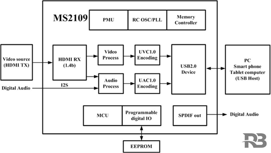 MS2109是一款高清視頻采集芯片,內(nèi)部集成USB2.0控制器和數(shù)據(jù)收發(fā)模塊、HD RX模塊和音視頻處理模塊。MS2109可以將HD 接口輸出的音視頻信號通過USB 接口傳送到PC、智能手機或平板電腦上預覽或采集。USB視頻符合UVC規(guī)范,音頻符合UAC規(guī)范,音頻支持I2S輸入和SPDIF輸出,支持Windows、Android和MacOS 系統(tǒng)。