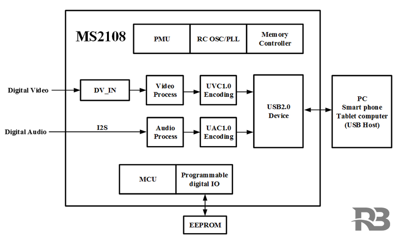 MS2108 is a digital video and audio acquisition chip that integrates a USB 2.0 Device controller, data transceiver module, digital video input processing module, I2S input processing module, and audio and video processing module internally. The MS2108 can transmit digital audio and video signals to PCS, smartphones, and tablets via a USB interface for preview or collection. The MS2108 supports both YUV and MJPEG output modes and is compatible with Windows, Android and MacOS systems.