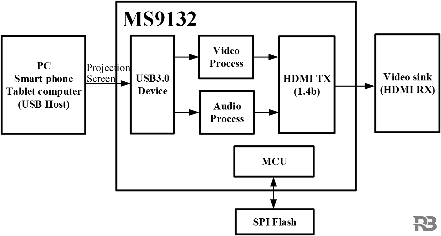 MS9132 is a USB 3.0 screen projection chip that integrates a USB 3.0 Device controller, data transceiver module and audio and video processing module internally. The MS9132 can display or expand information from PCS, smart phones and tablets to larger-sized display devices via the USB 3.0 interface and supports HD video interface output.