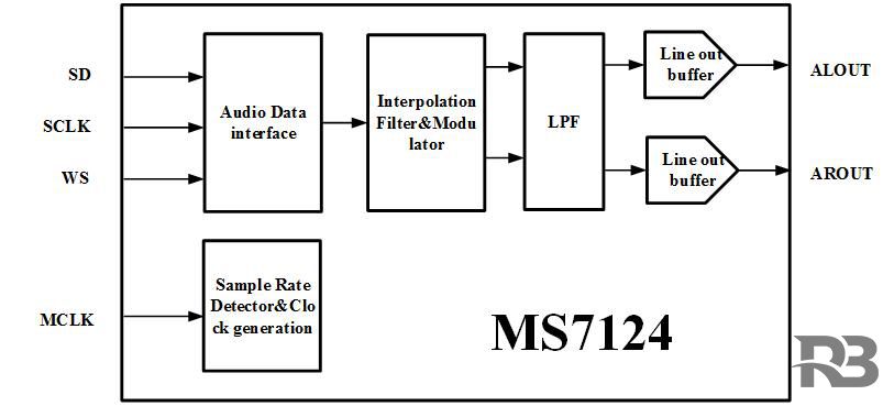The MS7124 is a high-performance 24-bit digital stereo audio DAC. This DAC adopts a Sigma-Delta structure and supports standard I2S digital signal input. Its output supports both stereo and mono.