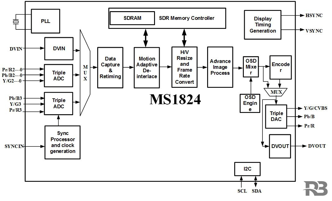 MS1824一款多功能視頻處理器,包含12通道10位視頻模數(shù)轉(zhuǎn)換(ADC)、TV解碼器、編碼器、三通道10位視頻數(shù)模轉(zhuǎn)換(DAC)、32位數(shù)字輸入輸出信號(hào)接口及字符型OSD功能。可處理隔行和逐行模擬視頻或者圖形輸入信號(hào)。有兩路獨(dú)立視頻播放引擎可支持視頻雙路播放。該產(chǎn)品提供了高質(zhì)量的視頻輸出。有解隔行輸入、視頻增強(qiáng)、3D消噪、YC分離以及幀率轉(zhuǎn)換的處理能力。OEM廠商可通過(guò)MS1824高集成度的視頻處理和高效的軟硬件解決方案輕松地設(shè)計(jì)出高質(zhì)量低成本的系統(tǒng)視頻解決方案。