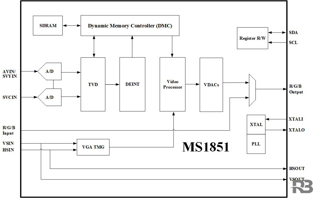 MS1851包含3D視頻解碼模塊,視頻處理模塊以及高速數(shù)模轉(zhuǎn)換模塊。視頻處理模塊支持gamma矯正功能,畫中畫功能,高品質(zhì)OSD顯示功能,幀率轉(zhuǎn)換功能以及隔行,逐行轉(zhuǎn)換功能。