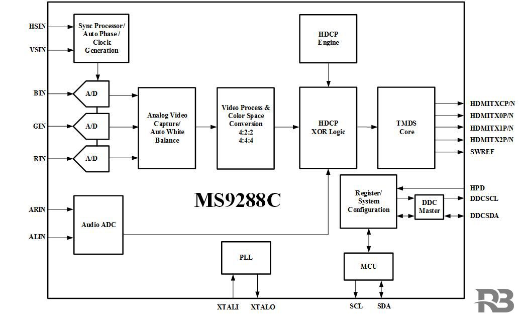 MS9288C是一款低成本、低功耗、高性能的VGA轉(zhuǎn)HD的轉(zhuǎn)換芯片,最大轉(zhuǎn)換速率為165MHz,具有三路10位視頻ADC、HD發(fā)射器和音頻編碼器。支持左/右聲道音頻輸入,內(nèi)置MCU和固件。