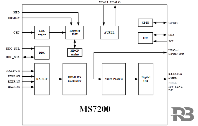 MS7200 是一款 HD 接收芯片,兼容 HD1.4b 及 HD 1.4b 下的視頻 3D 傳輸格式。可以支持的最高分辨率高達 4K30Hz,最高采樣率達到 300MHz.MS7200 支持 YUV 和 RGB 之間的色彩空間轉(zhuǎn)換,數(shù)字接口支持 YUV 以及 RGB 格式輸出。MS7200 的 IIS 接口以及 S/PDIF 接口支持高清音頻的傳輸,其中 S/PDIF 接口既可以兼容IEC61937 標準下的壓縮音頻傳輸,同時還支持高比特音頻(HBR)的傳輸,在高比特音頻(HBR)模式下,音頻采樣率最高為 768KHz.MS7200 內(nèi)置 EDID 緩存可供客戶量產(chǎn)方案燒錄。MS7200 的 IIC 地址可以根據(jù) SA 引腳進行選擇。當 SA 引腳上拉到電源電壓或者懸空時,地址為 0xB2。當 SA 引腳連接到 GND 時,地址為 0x56。