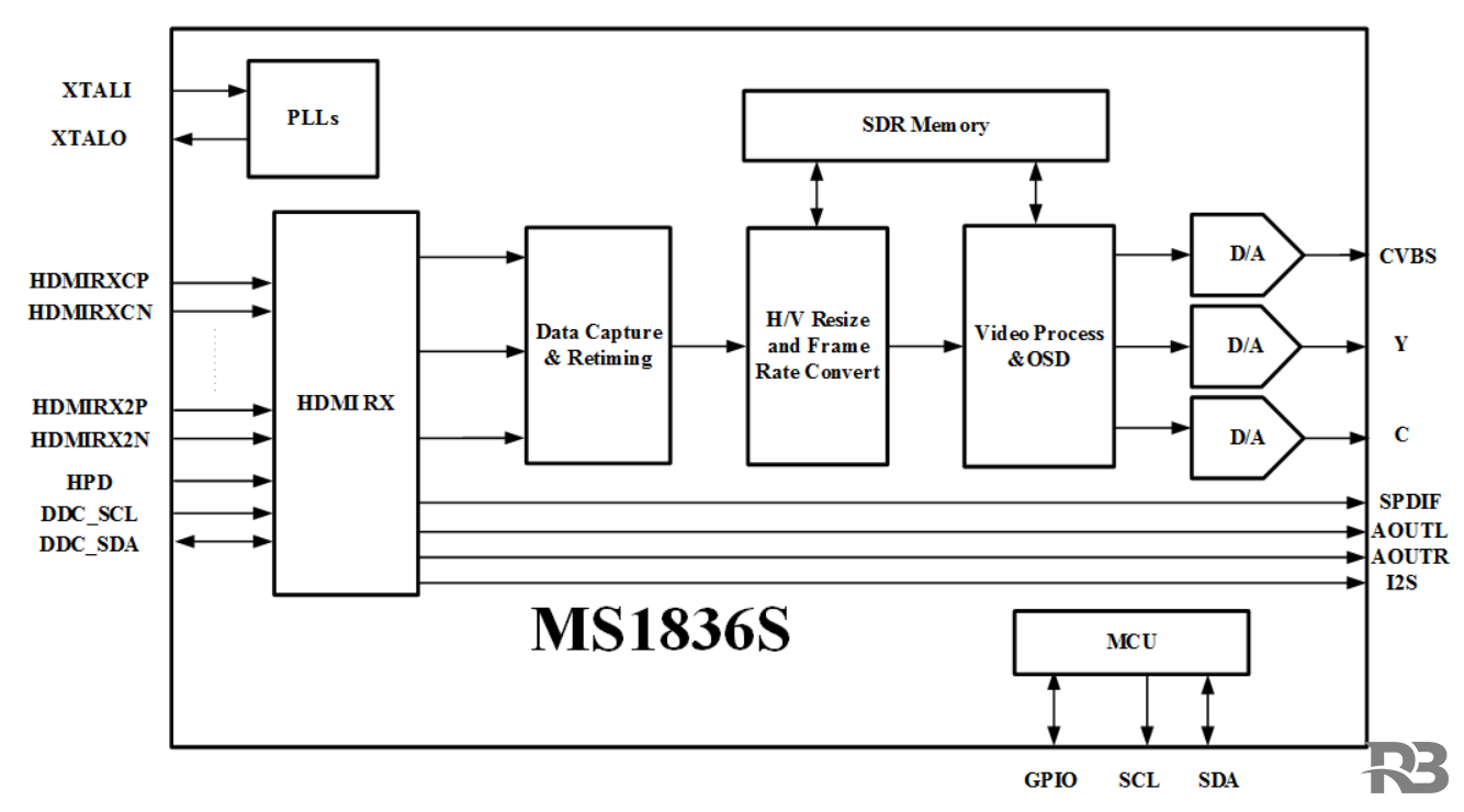 MS1836S 是一款單芯片的 HD 轉(zhuǎn) CVBS/S-Video 的轉(zhuǎn)換器,內(nèi)置 MCU 和存儲(chǔ)器。輸入為 HD 接收器,輸出有 NTSC/PAL 的編碼器和 10bit 的視頻 DAC,音頻支持模擬 L/R 輸出,內(nèi)置 OSD。有視頻增強(qiáng)處理,3D 降噪,亮度/色度/飽和度/清晰度調(diào)節(jié)功能。不需要用戶去配置,幫助用戶降低成本,提高使用的便捷性。